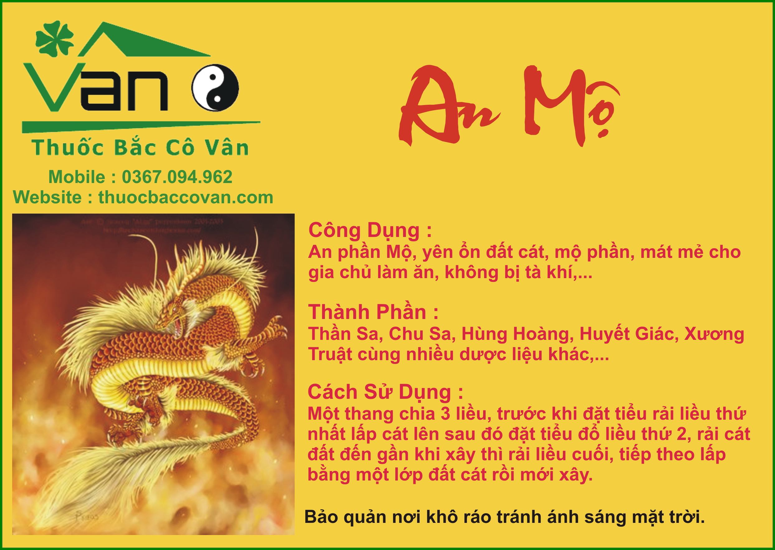 THUỐC BẮC CÔ VÂN biết được nhu cầu lớn trong mùa tảo mộ của nhân dân ta nên cho ra sản phẩm AN MỘ dễ sử dụng lại tiện lợi, 100% thuốc Đông y, không pha tạp và đảm bảo chất lượng, đáp ưng nhu cầu cho 1 mùa tảo mộ an lành, sản phẩm được nhiều gia đình tin dùng và là sản phẩm nhiều thầy mua về để làm cho gia chủ