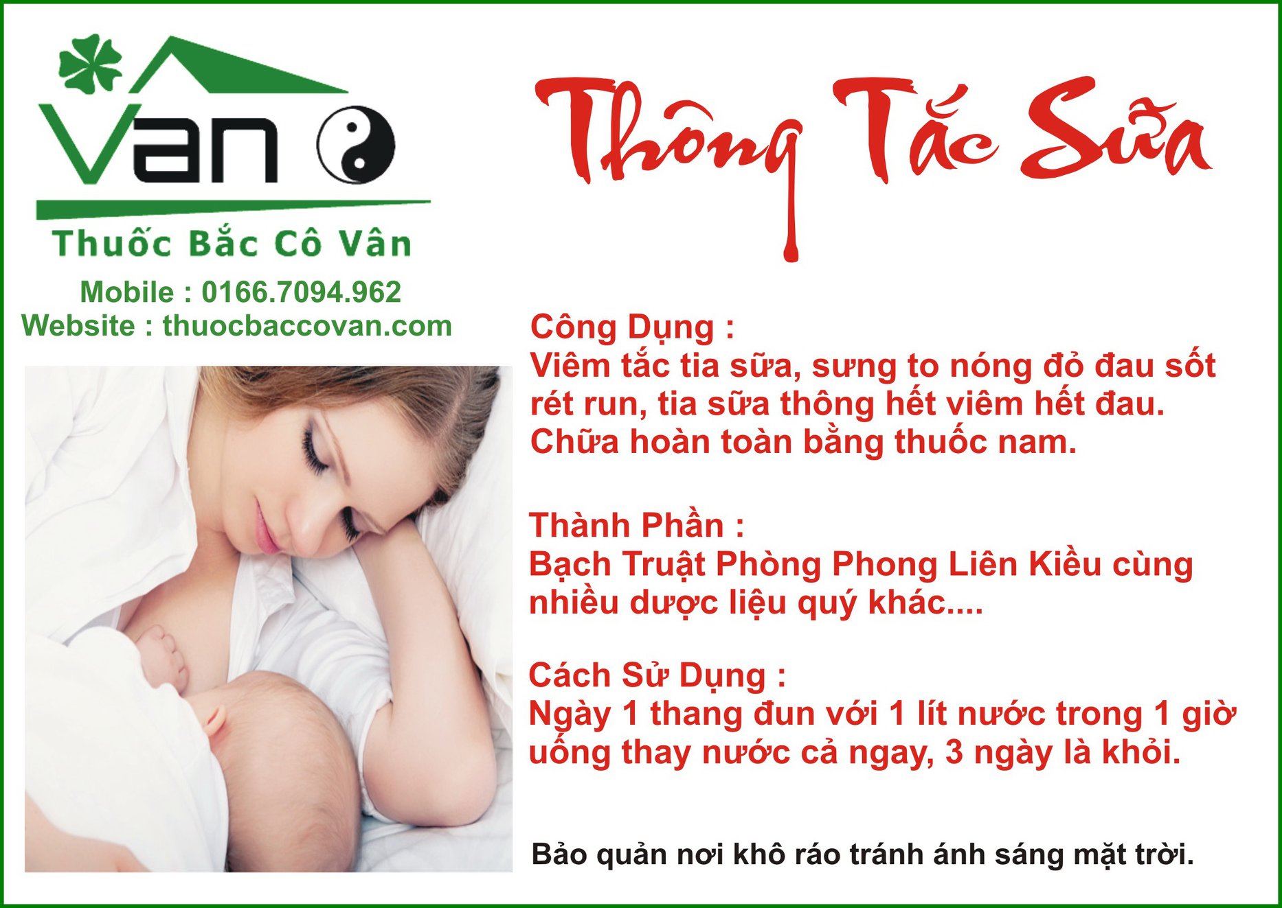 Hiểu được nỗi lo của các bà mẹ THUỐC BẮC CÔ VÂN cho ra mắt sản phẩm THÔNG TẮC SỮA, 100% sử dụng thuốc nam, an toàn hiệu quả, chỉ 3 ngày là khỏi, bài thuốc đã được gia đình bán và được nhiều người sử dụng rộng rãi trên thị trường.